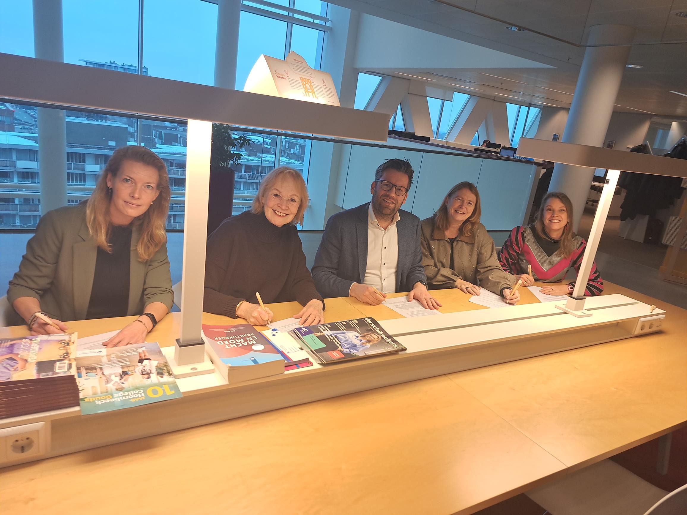 Op de foto de ondertekenaars van links naar rechts: Janneke van der Zalm (Hecht ZVH MH), Marianne Straks (Zorgpartners MH), wethouder Jan Kees Oppelaar, Susan van der Steen (Woonpartners MH) en Anne ter Steege (Mozaïek Wonen).